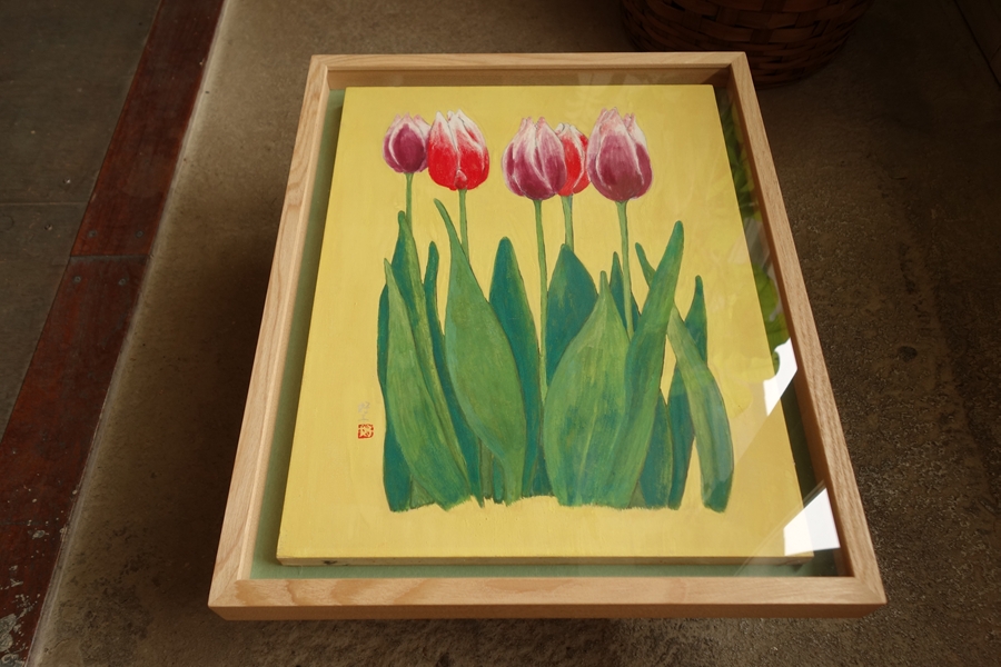 部屋に花を飾る感覚で、顔彩作品を立体的な箱型の額縁に飾る