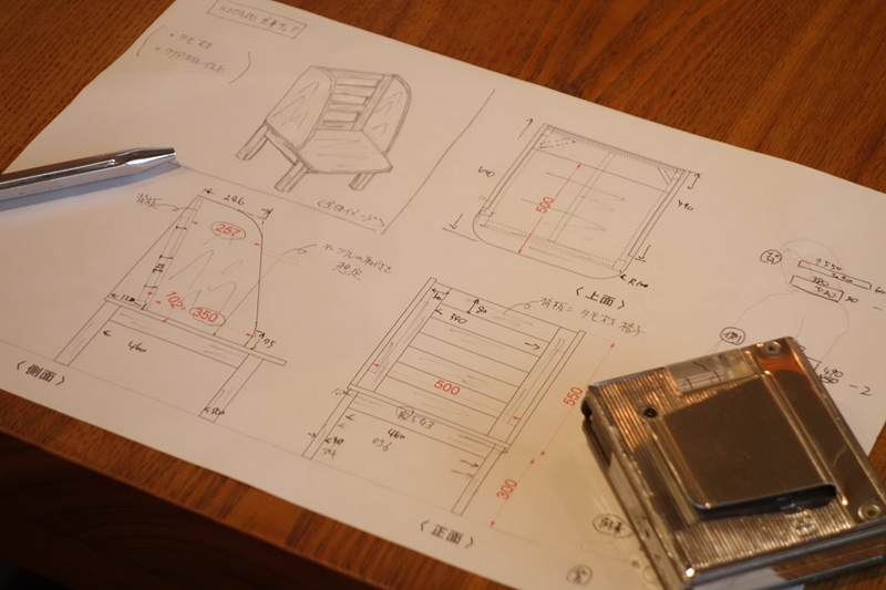 後日、簡単な板組みのサンプルを使ってサイズや角度を検討しました。そのサイズをもとに、使いやすくなる形を設計。