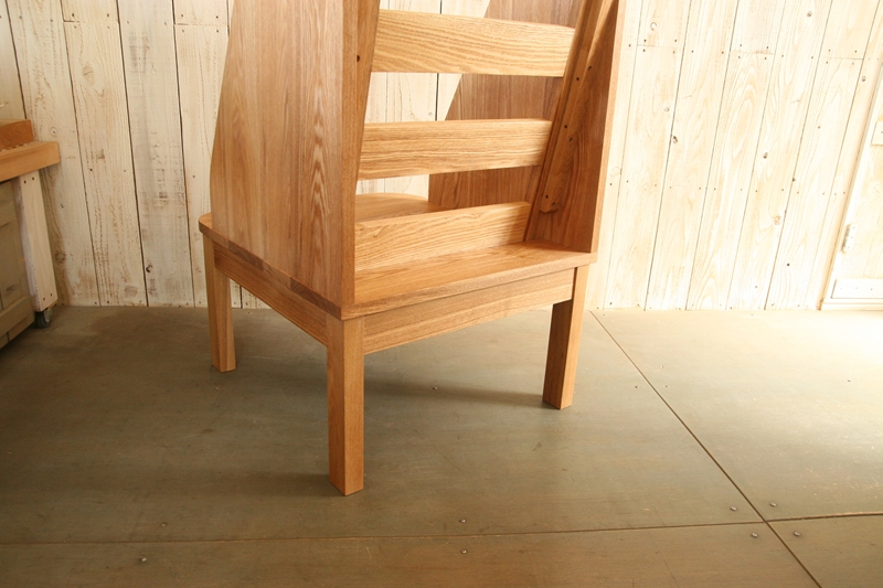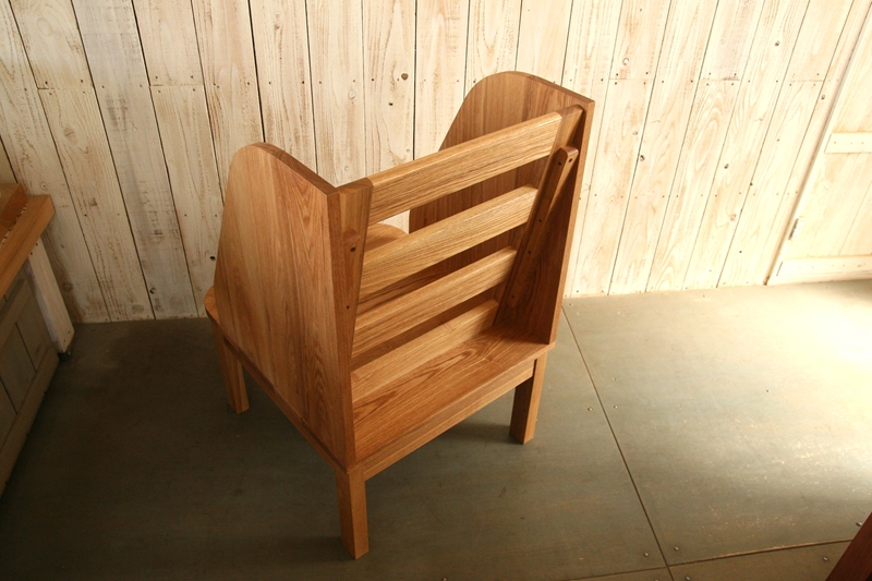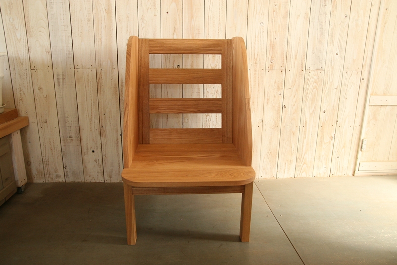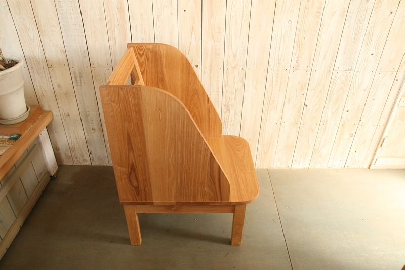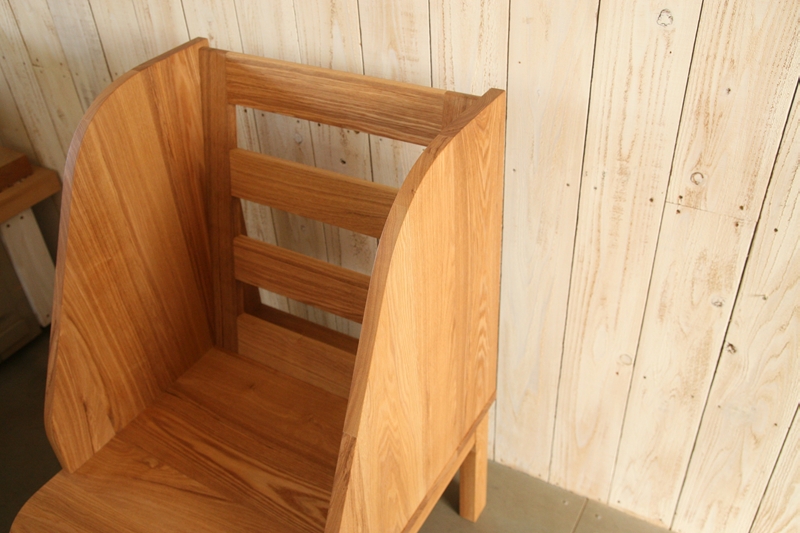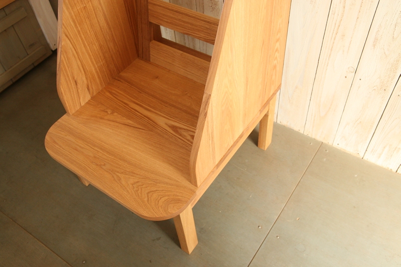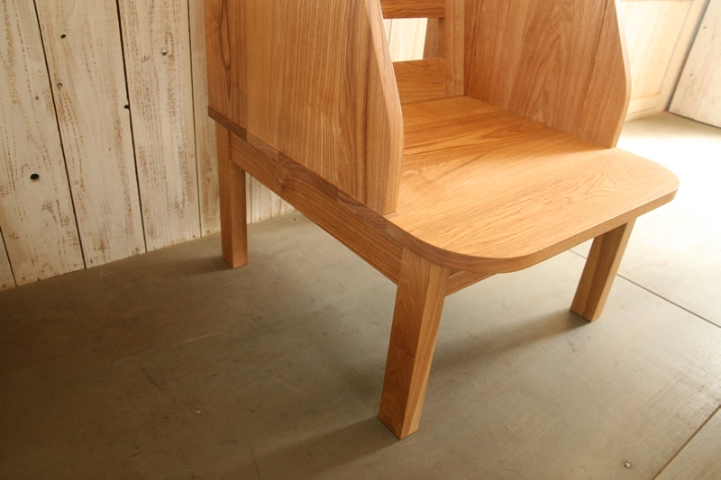 「ベイリーチェア」という名称で販売されているものもあるようですが、機能に特化するだけでなく、暮らしの場に並べても気持ちよく感じられるものを、マヤッカさんの形で作ってほしいとのご要望に沿い、無垢の木の良さが生きるよう仕上げていきました。