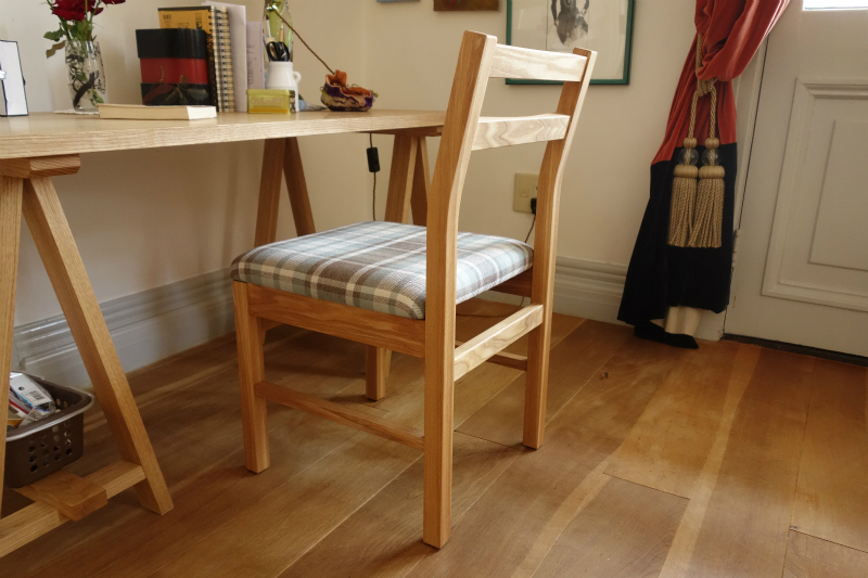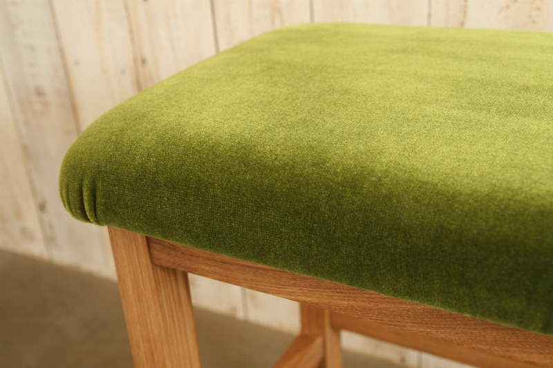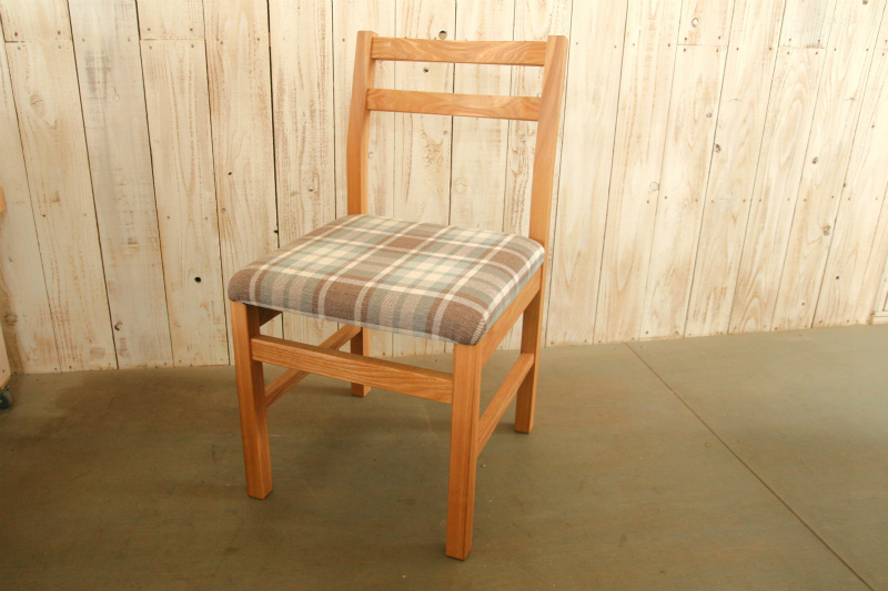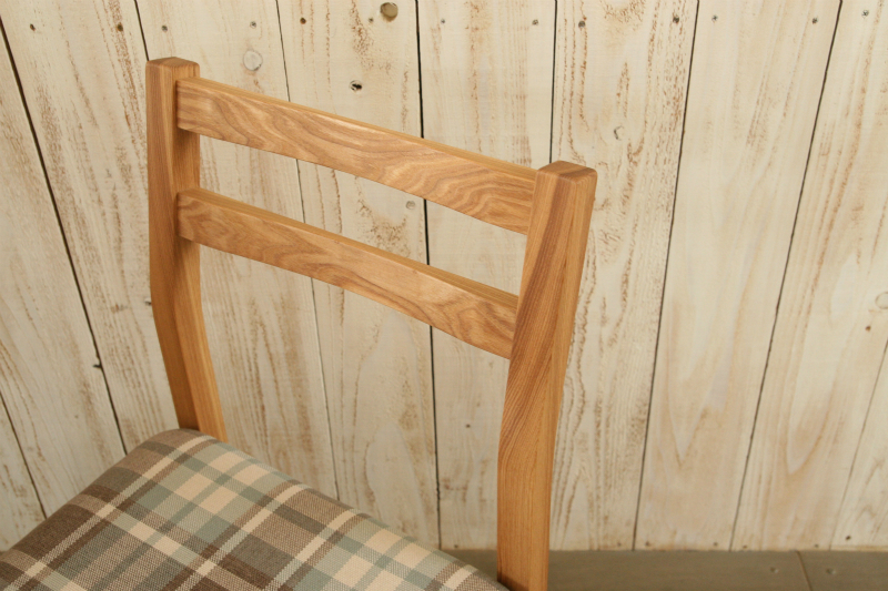 小さなデスクに合う椅子を探されていたお客様。N-チェアを基に、より軽くコンパクトに感じる椅子にしたいというご要望に合わせ、丈夫さを保ちながら各部材を少しずつ細くし、座面を低めに設計。希望された木目がしっかり感じられる部材、こだわって選ばれた張地を合わせた仕様で、製作しました。