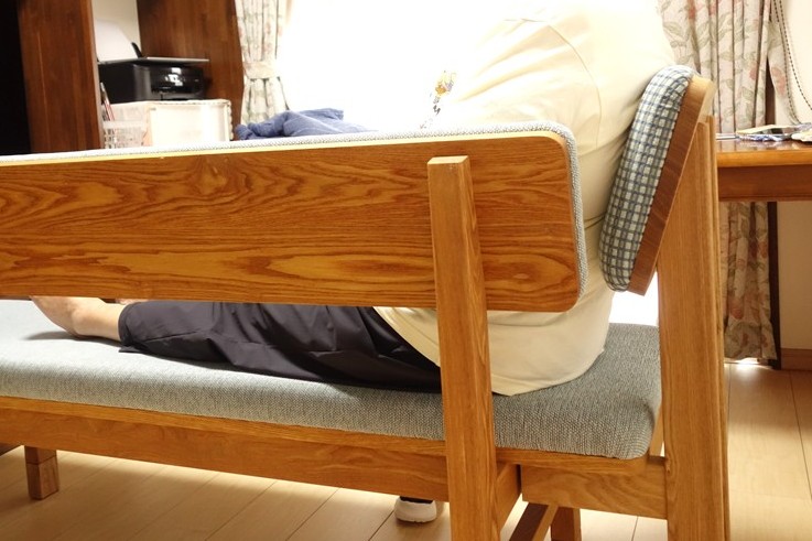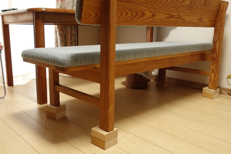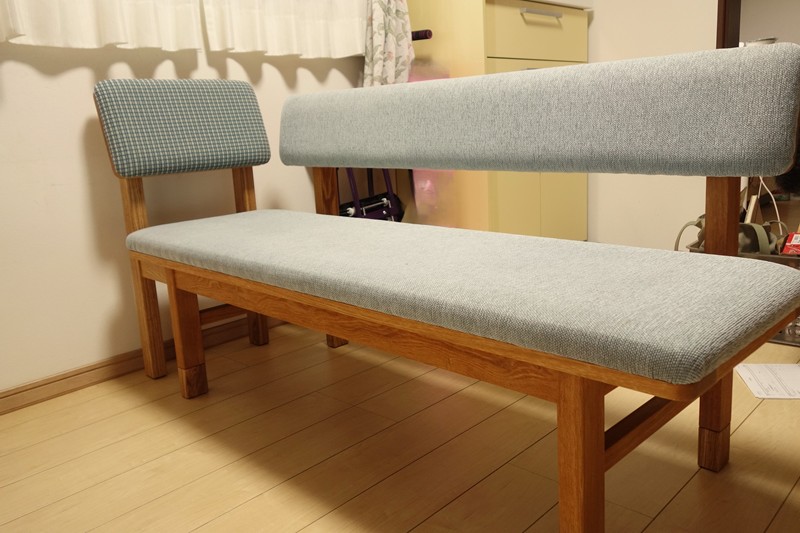 ご自宅で背もたれと延長用の脚を取り付け、新しいベンチ椅子が完成となりました。テーブルと並べて使う配置で、テーブルに向けば食事用の椅子として。横に向けば足を伸ばしてテレビを見ることができ、新しい背もたれによって、ゆったりとより寛げる椅子に生まれ変わりました。