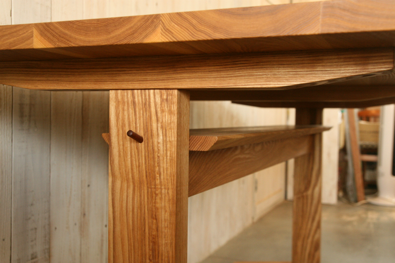 四隅に脚を付けるテーブルとは違い、天板の形をアレンジしやすい2本脚テーブル。使い勝手としては、長方形が合っているけど、丸み感があるのが好みというご要望で、天板の角に丸みを加える仕様に。どれくらい丸い感じがよいか伺い、その雰囲気に合わせた丸みで天板を製作。